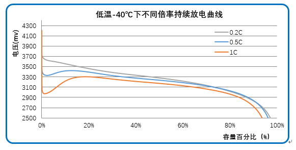 -40℃溫度0.5C放電之初最低電壓(低頭電壓)≥3.3V
